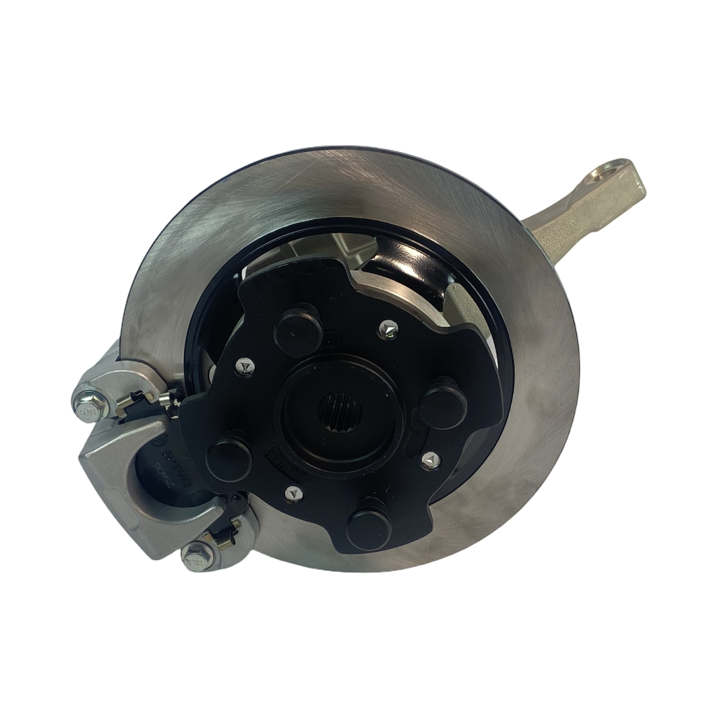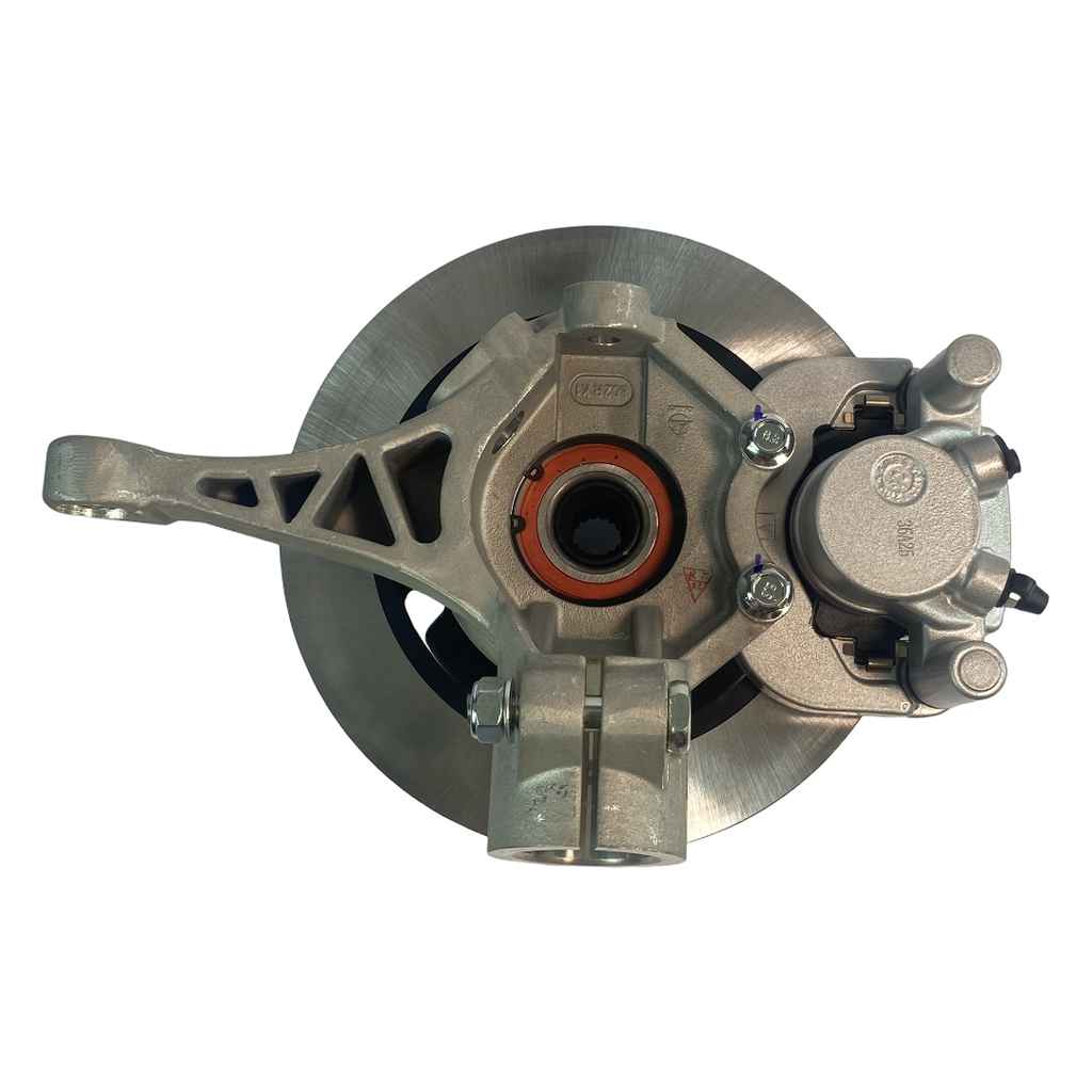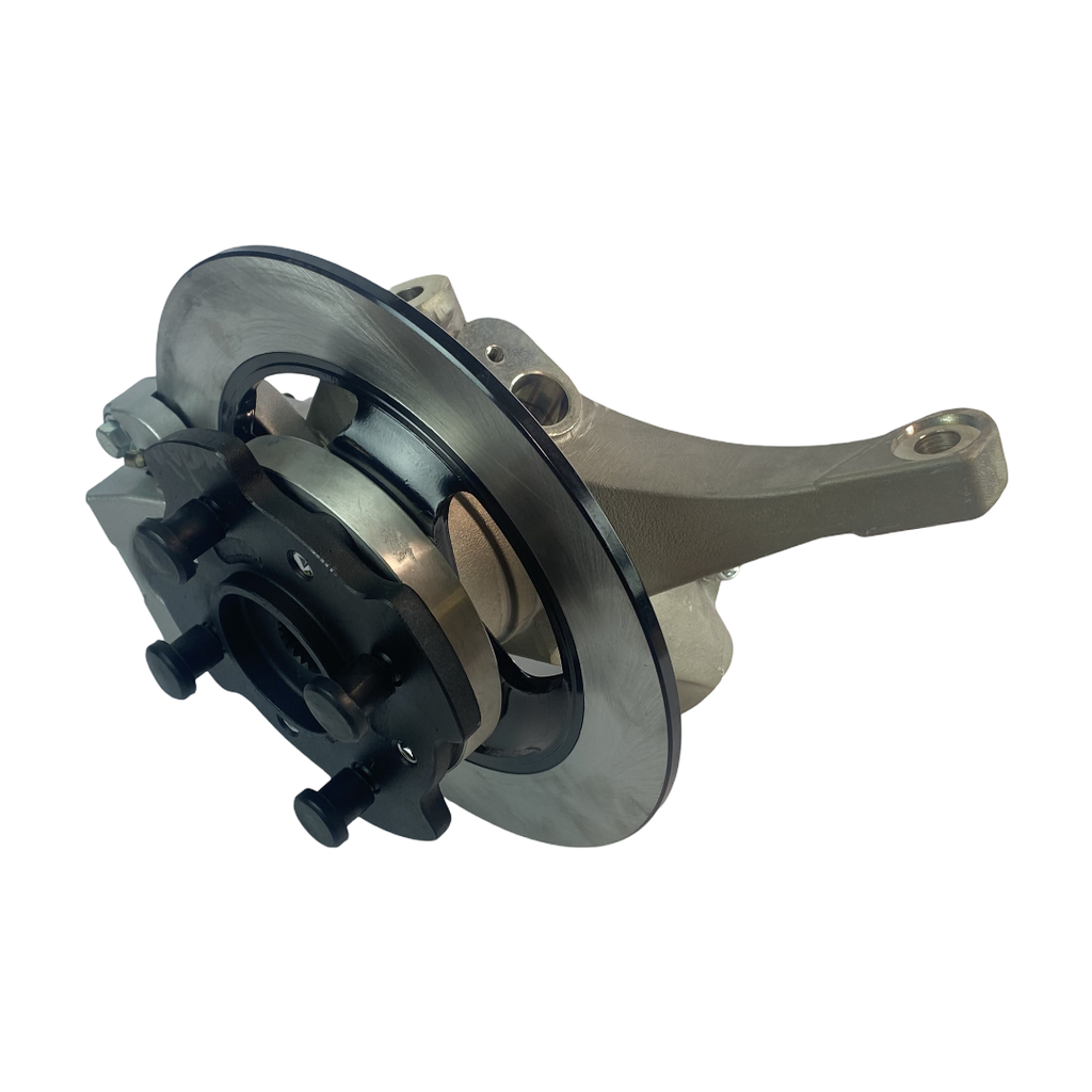 Komplett bakre navhållare med bromsskiva, hjulnav, bromsok och spindelhus till Chatenet mopedbilar med Kailing-bromssystemet.